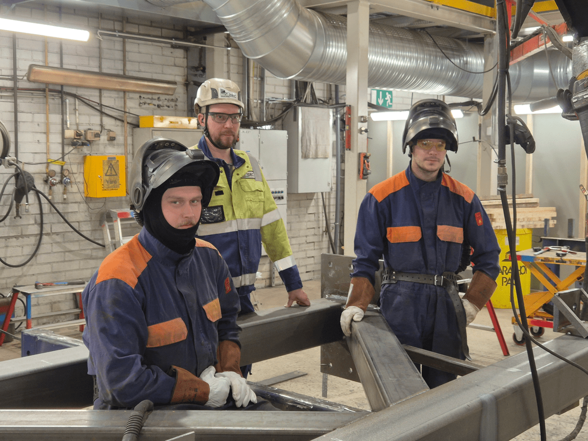Production Manager Kivelä with new welders Kallioniemi and Rintala.